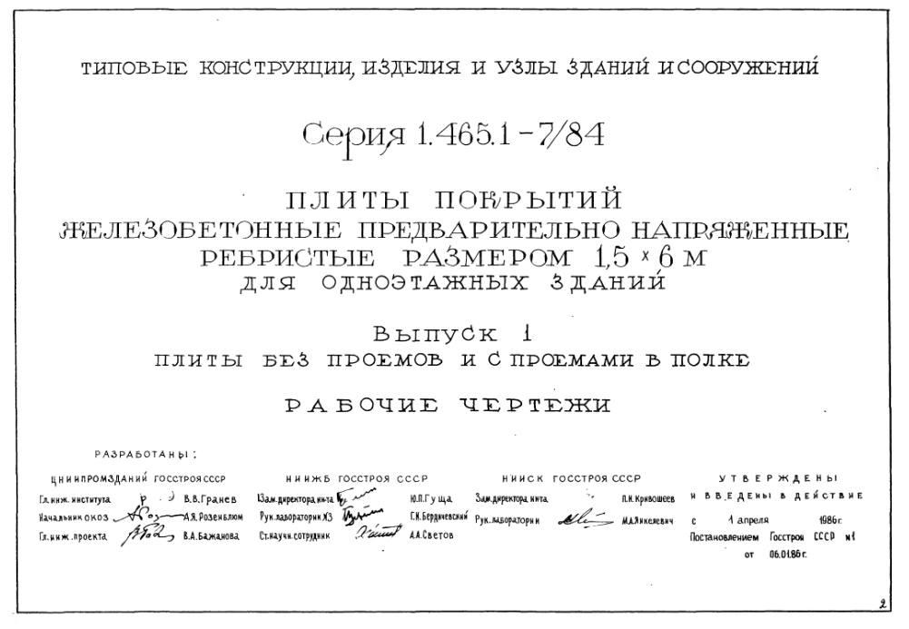 Серия 1.465.1-7/84. Плиты покрытий железобетонные предварительно напряженные ребристые размером 1.5х6 м для одноэтажных зданий.