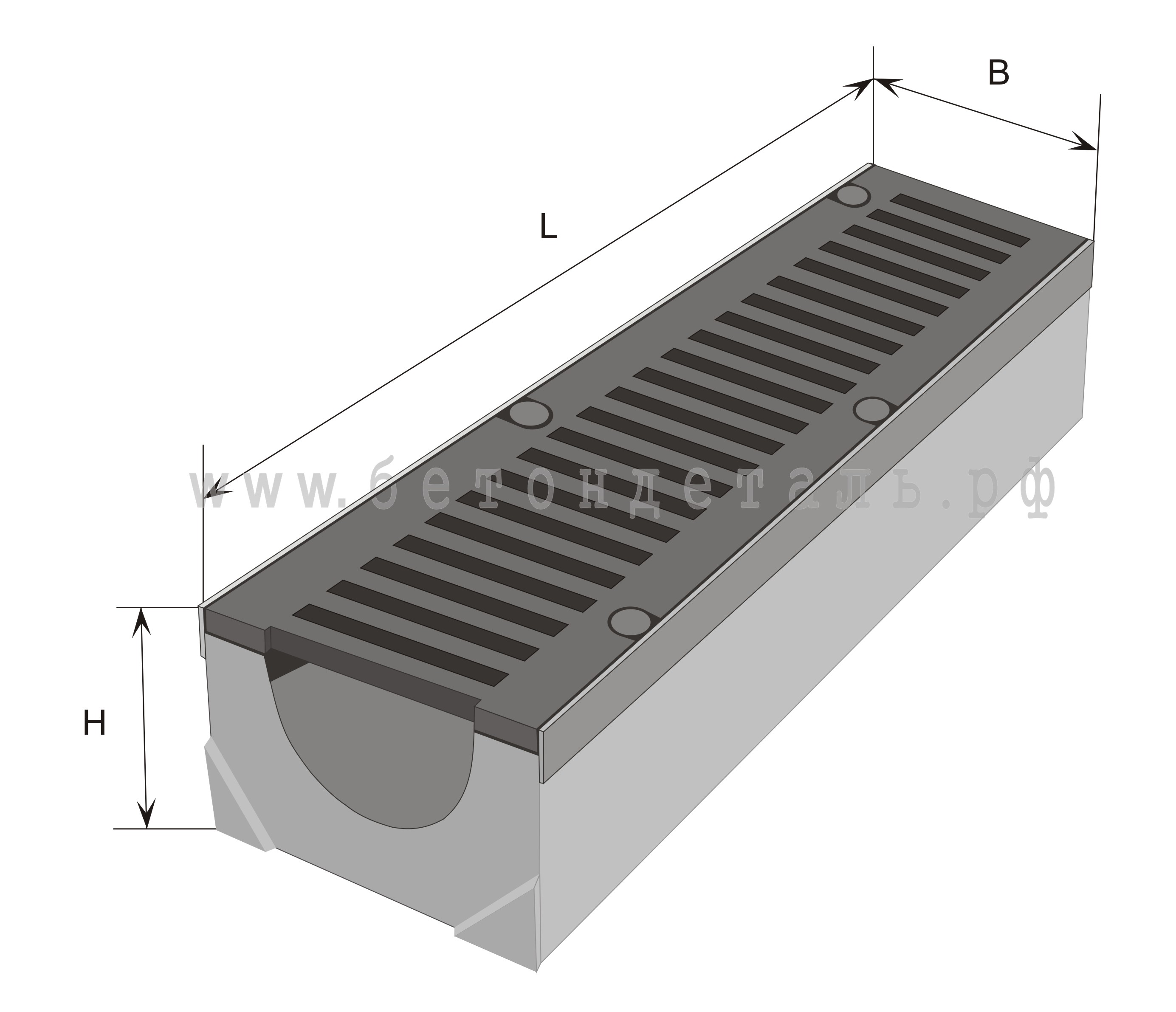 Маркировка водоотводных лотков представляет собой цифробуквенный набор, включающий в себя условные обозначения наименования изделия, глубины лотка, ширины и длины в дециметрах.